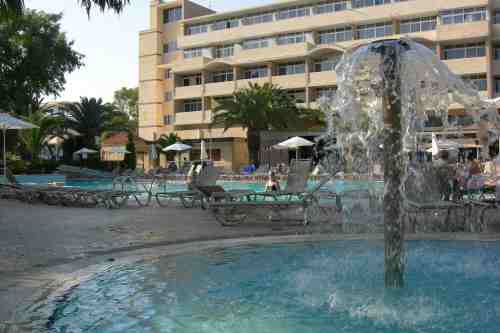Vi fant oss kjapt til rette på Atlantica Princess i Trianta, Ialyssos, her er Randi, Gunnar og Hilde utenfor inngangen og et eksteriørbilde.