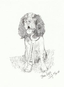 Da hunden Birk til våre gode naboer Frøydis og Geir vant første premie i klubbmesterskapet, tegnet jeg denne tusj-tegningen til dem.