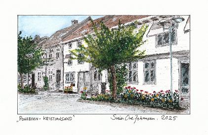 Har forsøkt å tegne Posebyen i Kristiansand litt i à la Thorbjørn Egner-stil eller Kjell Aukrust-stil, litt mer løssluppen uten linjal-strek.