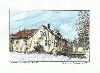 Mine venner Elisabeth og Jan Erik har et småbruk i Askim, og derfor har jeg laget denne akvarellen av våningshuset på Kløverud, gården deres som en liten vennskapshilsen.